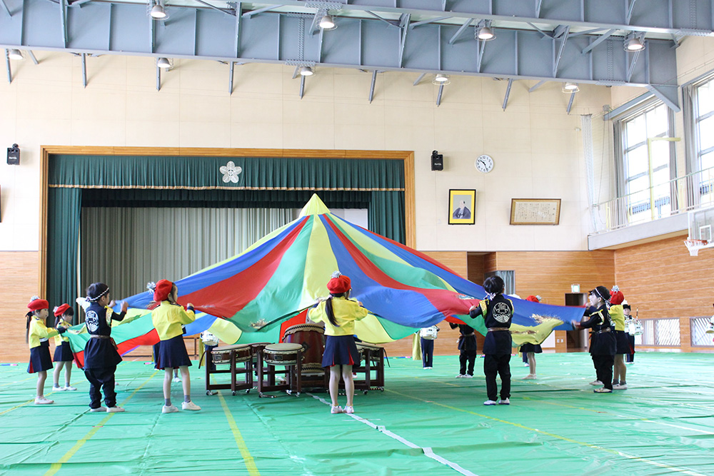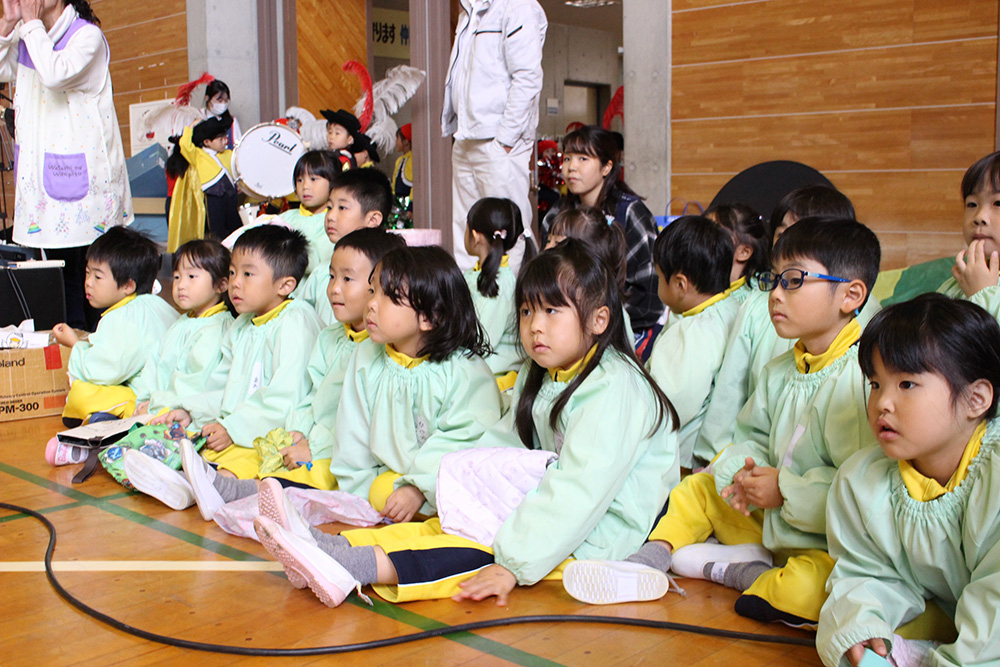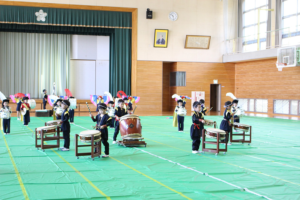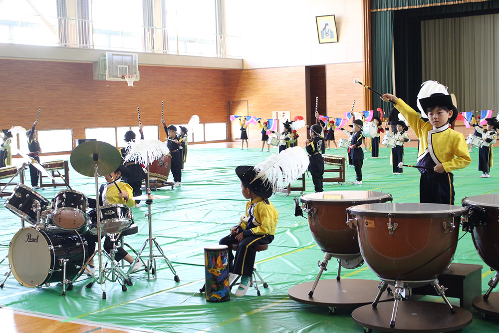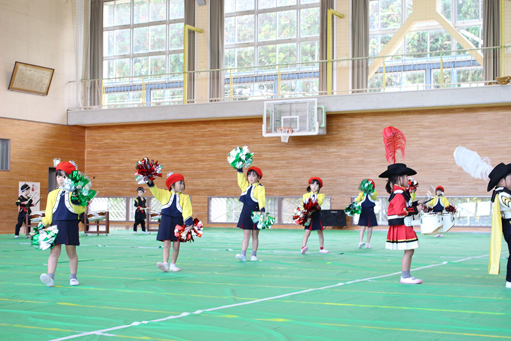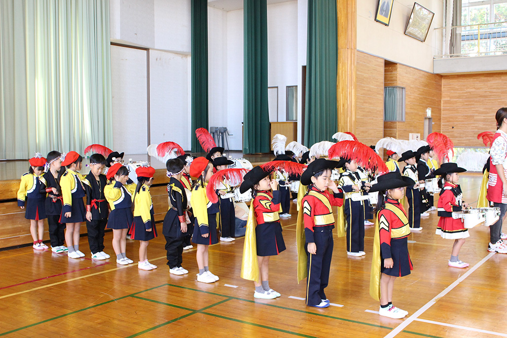 今日は10月30日に行われるマーチングの壮行式を旧第五中学校体育館で行いました。 本番と同じ衣装に身を包み、0歳児から年中組さんまで、 たくさんのギャラリーに見守られながら、少し緊張した様子の年長組さんでした。 演奏が終わり、沢山の拍手をもらうとホッとした表情が見られました。 当日も頑張れ!年長組さん!